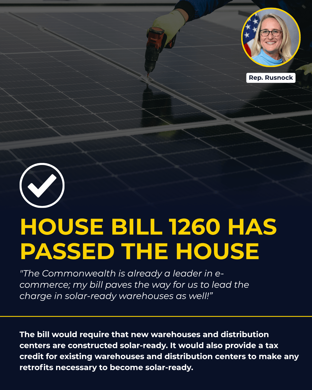 I’m proud to share that two of my bills passed the House last week! These pieces of legislation work to expand solar energy to warehouses and distribution centers (HB 1260) and boost flood insurance awareness to homeowners (HB 1718).
