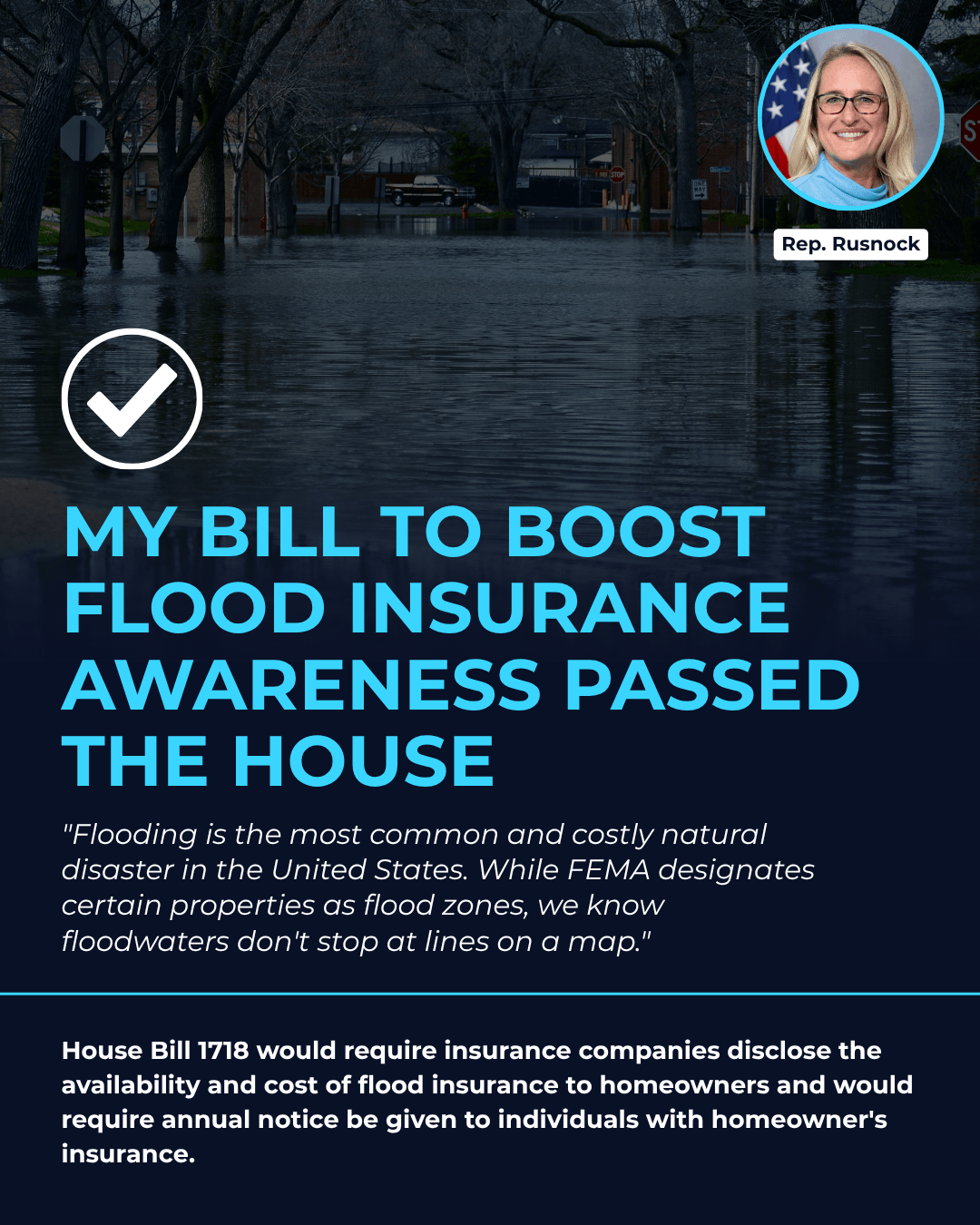 House Bill 1718 would require insurance companies offering or issuing homeowner’s insurance policies to notify homeowners of the availability and pricing of flood insurance. Additionally, it would require annual notice be given to individuals with homeowner’s insurance.