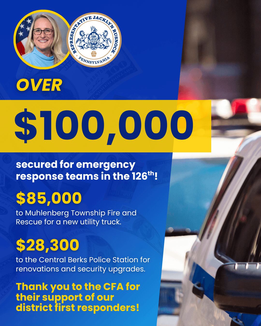 I’m proud to share that over $100,000 was recently approved for the 126th! The funding comes through the Local Share Account Program from the Commonwealth Financing Authority.