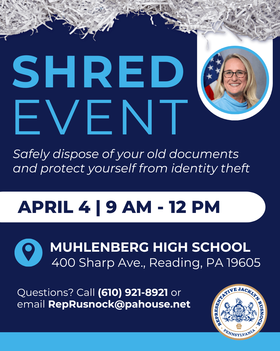 Shredding documents doesn't just declutter, it also protects you from identity theft! Join me on Saturday, April 4 at Muhlenberg High School for a free shredding event, where personal documents will be safely destroyed on-site.