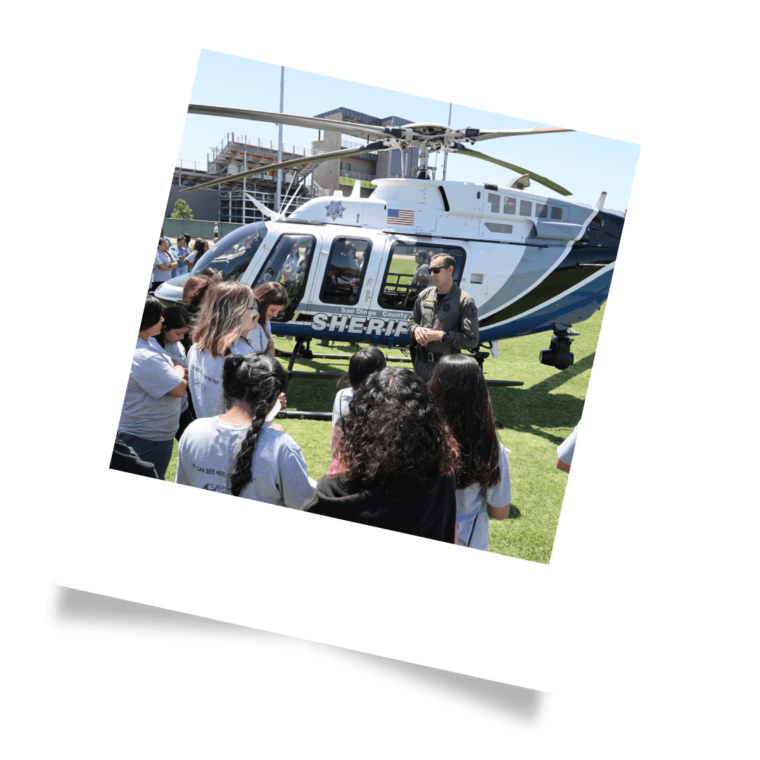ASTREA aterriza en el campo de fútbol del Palomar College como parte de la clase de la Academia Juvenil Femenina sobre Apoyo Aéreo a las Agencias Regionales de Cumplimiento de la Ley (ASTREA), donde un piloto explica el programa y responde a sus preguntas.