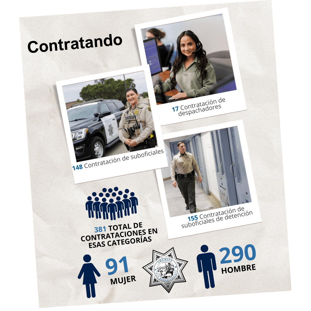 Resultados de Contratación En 2025, SDSO contrató: • 17 despachadores • 155 oficiales de detención • 148 oficiales de aplicación de la ley • 381 contrataciones totales (91 mujeres / 290 hombres)