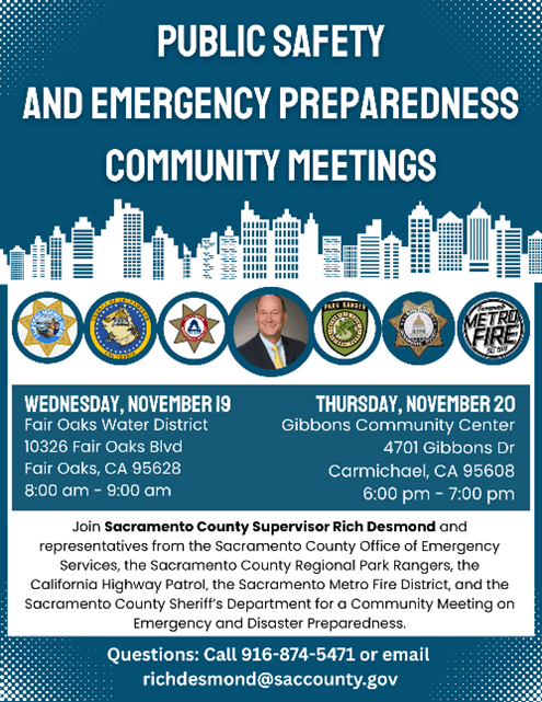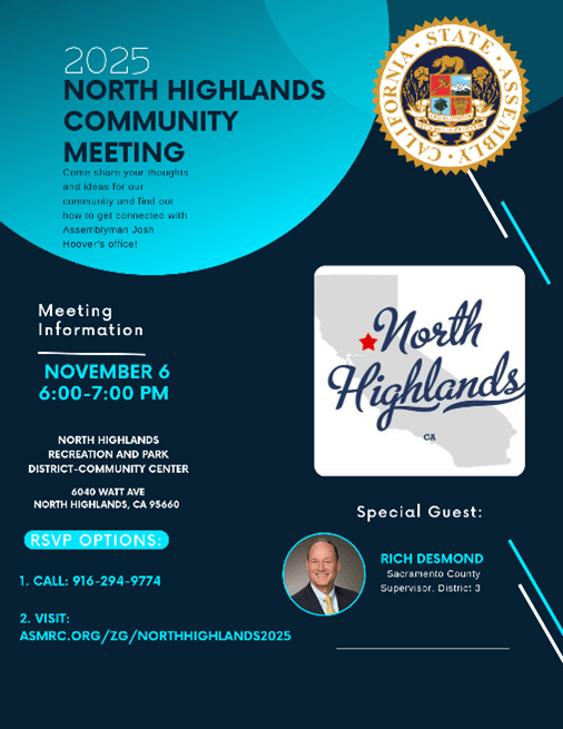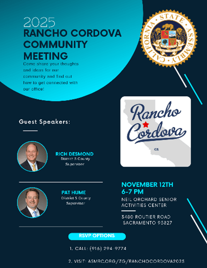| Please join me for a series of upcoming community meetings. First, I will be joining Assemblyman Josh Hoover in North Highlands on Thursday, November 6th and in Rancho Cordova on Wednesday, November 12th. Next, I will be hosting two community meetings focused on public safety and emergency preparedness in on Wednesday, November 19, and Thursday, November 20. I will be joined by local law enforcement and Sac Metro Fire representatives and ready to answer questions you may have about disaster preparedness. All details can be found in the flyers below. | It was a busy month out and about in District 3! I was honored to attend many wonderful events celebrating grand openings, historic anniversaries, and even youth football. Here’s a quick recap: | The Fair Oaks Recreation and Park District celebrated the long-awaited grand reopening of Village Park, including the Performing Arts Center and Veterans’ Memorial Amphitheatre. The improvements are a huge upgrade and will be utilized by families and community members for years to come. Congratulations to the entire FORPD staff and Board! | Next, I was able to recognize the Carmichael Recreation and Park District’s 80th Anniversary during the annual Founder’s Harvest Festival at Carmichael Park. The Carmichael Recreation and Park District put on a great event that brought the community together, and we honored the CRPD’s legacy in not only its parks and facilities, but also years of memories created. | I traveled to Foothill Farms for the Homecoming game of the Foothill Jr. Mustangs. The program, headed by Coach Francisco, inspires and develops young athletes to learn the skills of hard work, sportsmanship, and leadership through football and cheerleading. It was a great way to spend a beautiful afternoon! Go Jr. Mustangs! | Next, I attended two important district events, the Carmichael Chamber of Commerce Elected Officials Mixer and the Arden and Howe Business Alliance State of the PBID. The Carmichael Mixer brought together many familiar faces and gave me a chance to connect with chamber members. It was a great turnout for the Arden-Howe Alliance. I joined DA Thien Ho and Congressman Ami Bera to congratulate Sacramento County’s newest PBID on the great work they have already done, bringing businesses together to make Arden Arcade thrive! | My staff had a wonderful time at the San Juan Education Foundation’s Evening of the Stars, which celebrated exceptional alumni of San Juan Unified who exemplify commitment, leadership, and excellence. Sacramento County’s very own Deputy Director of Child Protective Services, Melissa Lloyd, was one of the evening’s honorees. Congrats, Melissa, and each of the STARS. | I also had the opportunity to speak at the College-Glen Neighborhood Association/Foundation’s annual meeting with elected officials. I always appreciate getting to meet with neighborhood associations across the district and discuss issues that are most important. Thank you, CGNA, for having me at this event. | Last week, I was honored to be a part of the grand opening and ribbon-cutting for Dignity Health - Mercy San Juan’s new Graduate Medical Education Resident Suite and Lounge. This facility officially makes Mercy San Juan a teaching hospital. This is a direct investment in the future of healthcare, training dedicated Internal Medicine residents who will serve and strengthen the Sacramento region and beyond. Residents trained here will serve communities, be leaders, and ultimately save lives. | Lastly, I joined the Sunrise Recreation and Park District, Citrus Heights Arts, Sac Republic FC, and Bank of America for the grand opening and of a new multi-use basketball court/mini soccer pitch at Walerga Park Futsal Court. This was a big project with much-needed upgrades, and I am proud to have been able to contribute to its success. Thank you to all the community partners for your efforts to make Foothill Farms stronger! | SPECIAL ELECTION NOVEMBER 4, 2025 | Tuesday, November 4, 2025, is the Statewide Special Election, and ballots are in hand (and hopefully already filled out and on their way back to the Elections Office, either by mail or Drop Box). But never fear, if you haven’t yet returned your voted ballot, you still have plenty of time. For those voters who missed the Oct. 20 voter registration deadline, you can still visit the Election’s Office in-person or visit one of the Vote Centers to conditionally register and vote. Vote: Pick a Way, ANY Way Choose how, when and where you want to vote. - By Mail: All registered voters received a ballot in the mail. Place the voted ballot inside the envelope provided, sign the envelope and return – your postage is paid! Ballots must be postmarked by Nov. 4 to count.