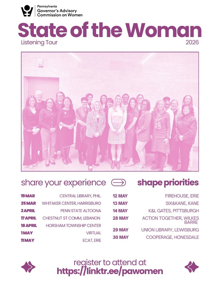 In addition to the survey, the Commission will host 13 listening tour stops across Pennsylvania, including one virtual session, to hear directly from women in their communities.