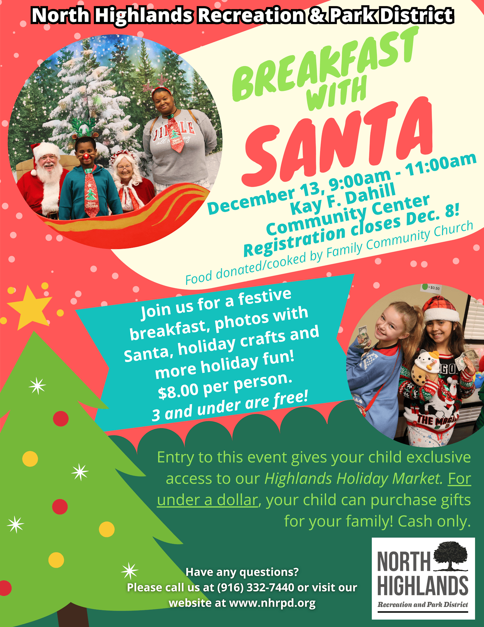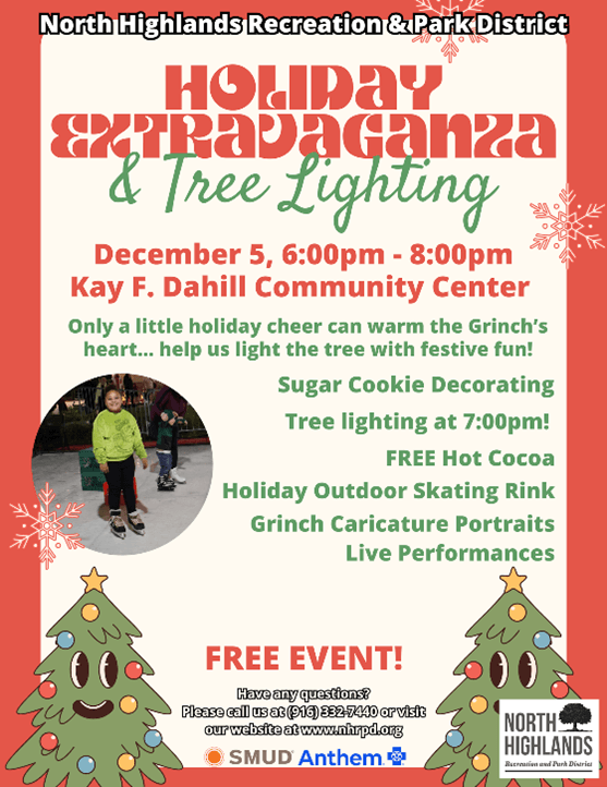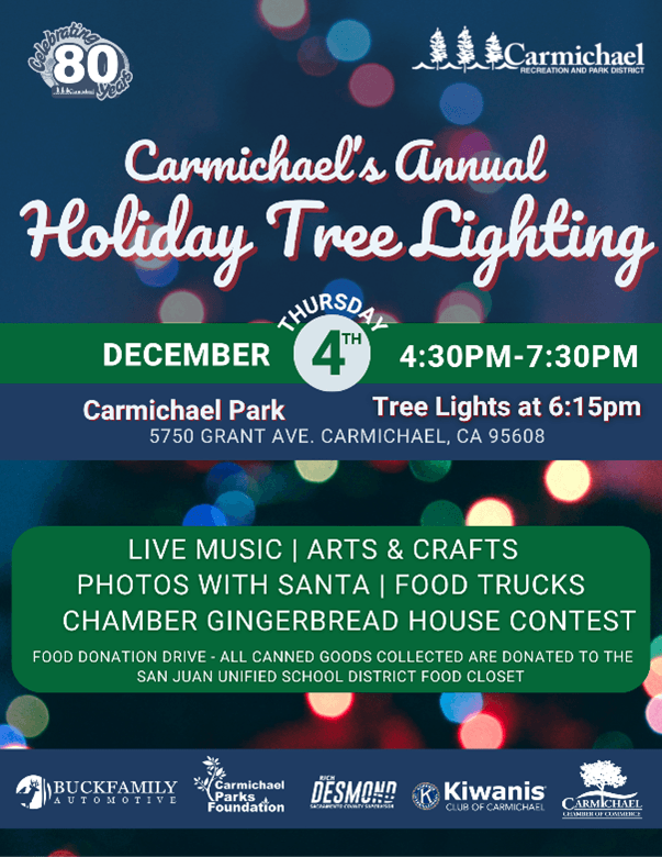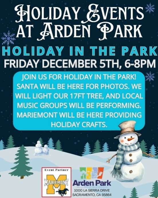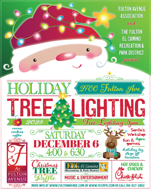 | With the holiday season upon us, I’m grateful for the many ways our District 3 neighborhoods come together to celebrate and support one another. There are so many wonderful community events happening throughout the district, and I hope you’ll join us in the spirit of connection and joy. Wishing you and your loved ones a safe, meaningful, and very happy holiday season. | Friday, December 5 | 6:00 pm-8:00 pm | Holiday in the Park Join the Arden Park Recreation and Park District for their annual Holiday in the Park! Santa will use his Christmas magic to light up the 17-foot tree and the community center for the holidays! Local music and talent groups will take the stage and help celebrate the kickoff to the holiday season. Pictures with Santa will be available after the tree lighting, as well as hot chocolate and crafts for kids! For more information, visit the Park District website. Location: Arden Park, 1000 La Sierra Drive, Sacramento, CA 95864 | Saturday, December 6 | 4:00 pm-6:30 pm | 19th Annual Holiday Tree Lighting Join the Fulton Avenue Association and the Fulton-El Camino Recreation and Park District at the Tree of Grace at the Sacramento County Department of Human Assistance parking lot, 2700 Fulton Avenue, for the annual Holiday Tree Lighting. There will be music, entertainment, and a Christmas tree raffle. Fun and games at Santa’s Workshop and FREE coffee, cocoa, cookies, and food (as long as supplies last). You can find more information on the Fulton-El Camino Recreation and Park District website. | Saturday, December 6 & 13 | Every half hour from 5:30 pm-9:00 pm What better way to celebrate the holidays than with a horse-drawn sleigh ride through Arden Park? From the company that does sleigh rides through the fab 40's, Top Hand Ranch Carriage Company and APRPD are providing residents with a fun holiday experience! Sleigh capacity: 4 adults & 2 children max. For more information, visit the Holiday Sleigh Rides - Arden Park Recreation and Park District website. | Friday, December 5 | 6:00 pm-8:00 pm | Holiday Extravaganza and Tree Lighting Don’t let the Grinch steal this holiday season! Come and help Cindy Lou Who and help the Grinch by lighting up the holidays with a night full of festive fun! Enjoy activities like cookie decorating, a free hot cocoa bar, and roll into the season at our Winter Ice Rink. The magical tree lighting kicks off at 7:00 PM, followed by a snowfall that will make even the Grinch’s heart grow three sizes! For more information, visit NHRPD’s website. Location: Kay F. Dahill Community Center (Outdoors) 6040 Watt Ave, North Highlands, CA 95660 | Saturday, December 13 | 9:00 am-11:00 am | Breakfast with Santa Slip into your coziest holiday PJs and get the holiday magic rolling at Breakfast with Santa! Enjoy fluffy pancakes, tasty breakfast favorites sponsored by Family Community Church, warm coffee, and juice while making magical memories. Snap a photo with Santa, write your letter to the North Pole, and get creative with a holiday craft! Online registration is required and closes on December 8, 2025. Register on the NHRPD website. Location: Kay F. Dahill Community Center, 6040 Watt Ave, North Highlands, CA 95660 Participation Fee: $8.00 per person. | Thursday, December 4 | 4:30 pm-7:30 pm | Carmichael’s Annual Holiday Tree Lighting Kick off the Holiday season at Carmichael's Holiday Tree Lighting Event at Carmichael Park! Join us for live music, arts and crafts, and holly jolly fun! Santa will be available for visits and photos, at no additional cost, but we ask that you please donate one canned good per child. All canned goods collected are donated to the San Juan Unified School District Food Closet. Stick around to watch us light up the tree as a flurry of “snow“ falls at Carmichael Park! Sign up now for the Carmichael Chamber of Commerce Gingerbread House Contest! Gingerbread Houses will be displayed and judged at this event. Visit the Holiday Tree Lighting - Carmichael Recreation and Park District website for more information Location: Carmichael Park - 5750 Grant Avenue, Carmichael, CA 95608 | Friday, December 5 | 5:00 pm-9:00 pm $10 | Saturday, December 6 9:00 am-5:00 pm | Sunday, December 7 | 9:00 am-3:00 pm | Carmichael’s Best Holiday Craft Fair Come out and enjoy the 47th Annual Holiday Show of Hands Craft Fair. There will be custom work by over 150 crafters and artists, featuring handcrafted gift items, decor, collectibles, antiques, delicious food, and of course, our can’t-miss silent auction is back! The Holiday Show of Hands Christmas Craft Fair is a very special annual event drawing over 10,000 people annually and is put on by the parents and staff of St. John the Evangelist School in Carmichael, with 100% of proceeds raised directly to benefit the school. For more information, check out the St. John the Evangelist website. | December 4 | 5:00 pm-8:00 pm | Fair Oaks Tree Lighting Celebrate the magic of the season at the Fair Oaks Tree Lighting event, back in Village Park! Bring the whole family for an evening filled with heartwarming holiday cheer, including photos with Santa, the Grinch, and Elsa, community performances, children’s activities, community candles, and more! Rain or shine! Follow the December Holiday Guide for more information about all the events for the month. For more information or to view the guide, visit the Christmas in Fair Oaks website Location: Village Park 7003 Park Drive, Fair Oaks, CA 95628 | Meristem Fair Oaks Holiday Events Feast of the Wreaths | Friday, December 5, 2025 | 5:30 pm – 9:00 pm Join Meristem for an unforgettable evening of chef-prepared fine dining, local wines and brews, an inspiring program, moving performances, and an auction, all curated the Meristem way, with warmth, authenticity, and unlike any other nonprofit banquet or gala. Feast of the Wreaths brings together local leaders, changemakers, and supporters to share in a special evening of connection, joy, and impact.