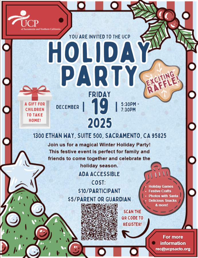 Applications must be received by January 2, 2026, to be considered. For more information about the Sacramento County Grand Jury, applicant criteria, and how to apply, please visit the Sacramento County Grand Jury website. | UCP of Sacramento and Northern California is hosting a Winter Holiday Party. Everyone is invited to join this festive event for family and friends to come together to celebrate the holiday season. There will be holiday games and crafts, photos with Santa, and delicious snacks. - Date: Friday, December 19, 2025