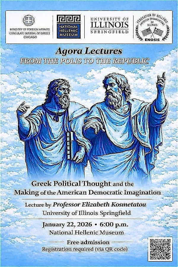 This event is presented in partnership with the Consulate General of Greece in Chicago, the University of Illinois Springfield, and the Federation of Hellenic American Organizations of Illinois (ENOSIS).