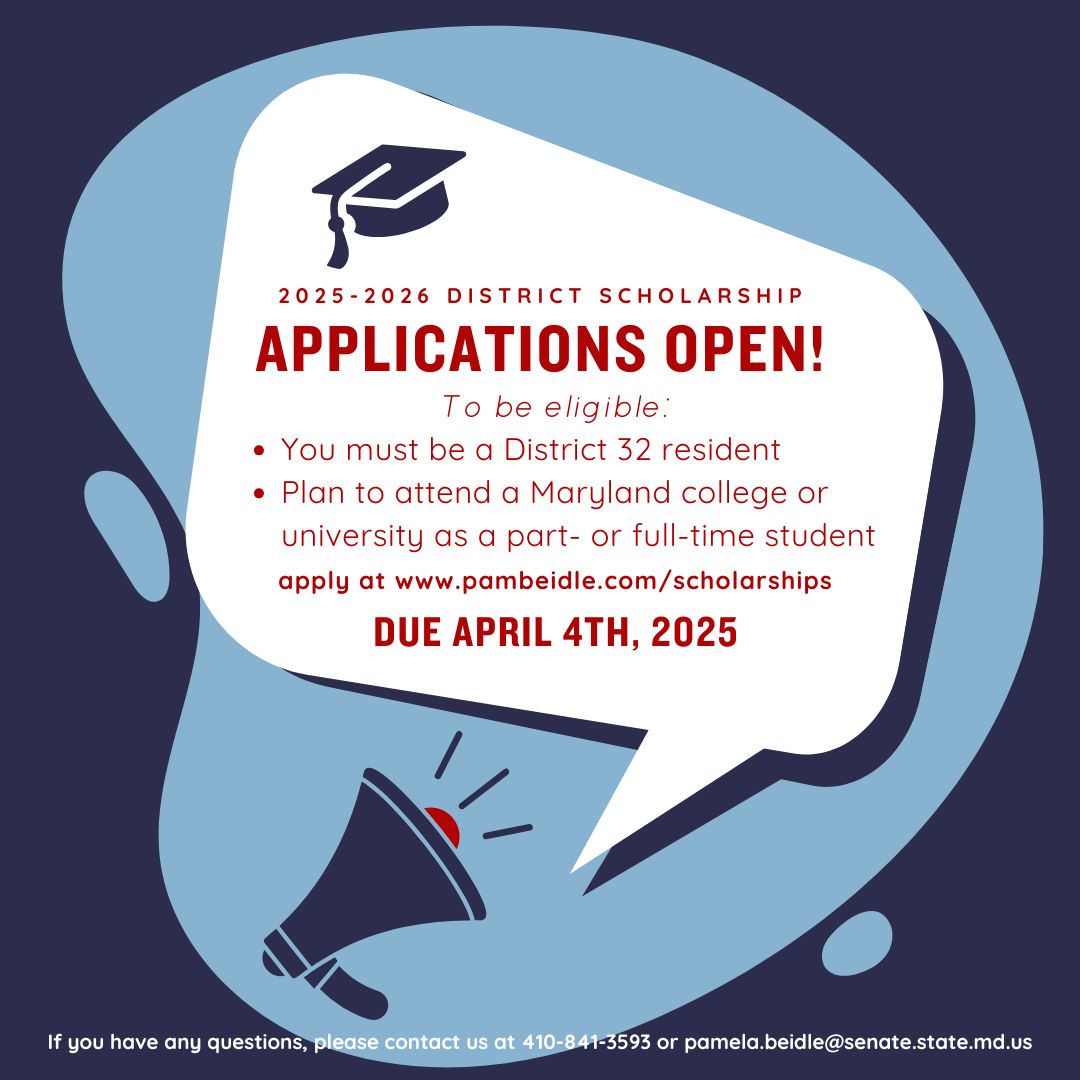 The 2025/2026 Senatorial Scholarship application is now available! If you are a resident of District 32 and a college-bound High School senior or currently attend a Maryland college or university, you’re eligible to apply. Simply fill out the application at www.pambeidle.com/scholarships by April 4th, 2025.