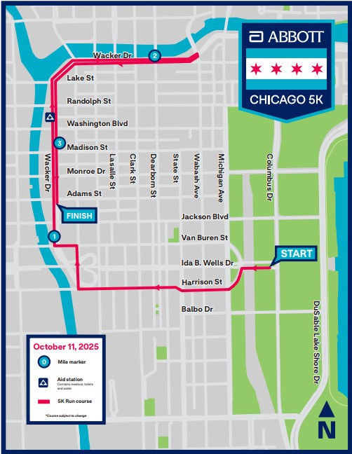 Street closures for the Abbot Chicago 5K will start at 6:30am on Saturday, October 11th, with parking bans starting at 1am. Streets in the Loop will be closed to traffic from 6:30am through 9:30am on Saturday. Click here for a list of closures.