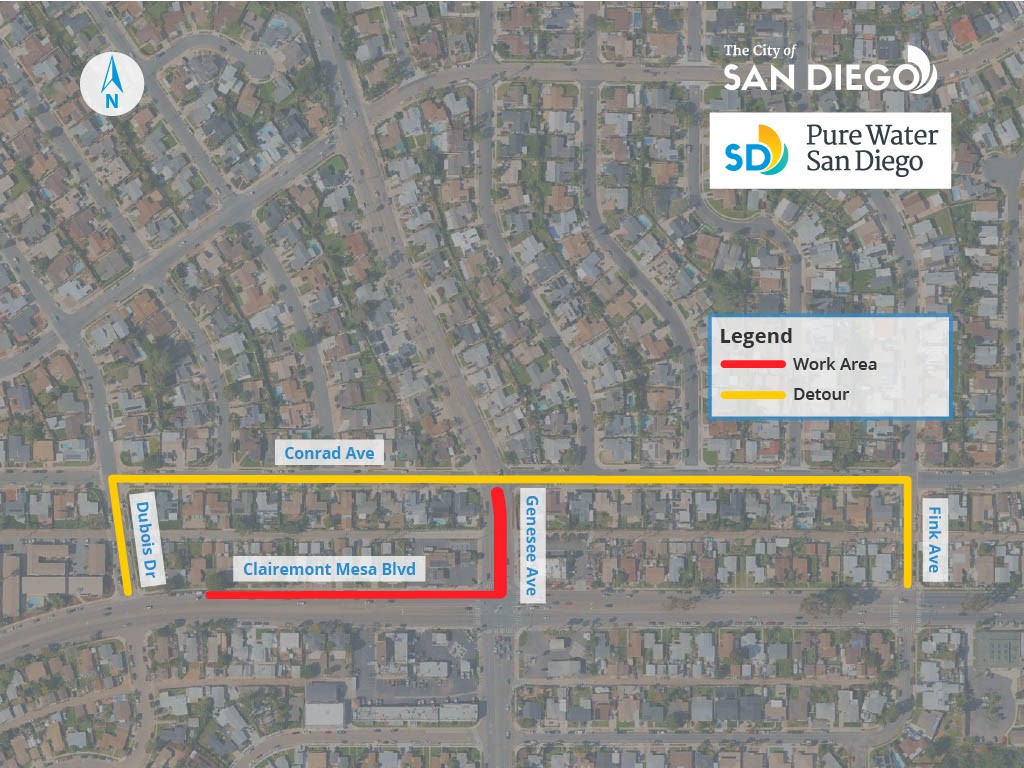 Beginning September 2, crews started installing pipes through the intersection of Clairemont Mesa Blvd. and Genesee Ave. Every street where pipeline is installed will be fully repaved curb-to-curb and re-striped. To maintain the safety of the community during this phase of work, crews are expected to perform overnight work at the intersection from 9pm to 5am Sunday through Friday, for approximately four to six weeks. During working hours, the intersection will be closed to traffic and detours will be in place. During non-working hours, the intersection will be fully opened to traffic. This schedule is subject to change. For your safety, please follow all posted signage.