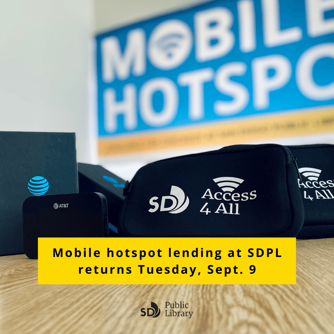 Beginning September 9, the Library Department's SD Access 4 All Hotspot Program is back! Due to software upgrades, this popular program has been on hold, but now residents can check out technology like mobile WiFi hotspots and Chromebooks for up to 30 days at a time. This program is meant to provide short-term internet access in the absence of a permanent connection. If you need help establishing a permanent Internet connection in your home, you can call one of the City's Digital Navigators at 1-800-350-6945 or visit your local library. To learn more about this program, click the button below.