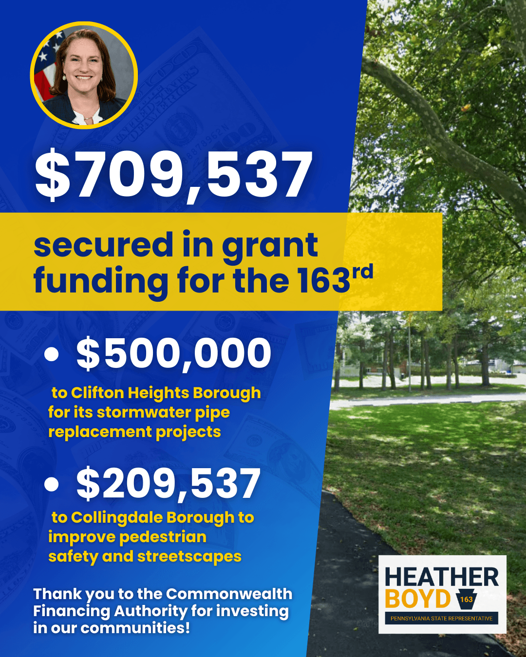 Exciting news for our district! Over $709,000 in grant funding from the Commonwealth Financing Agency is coming to the 163rd!