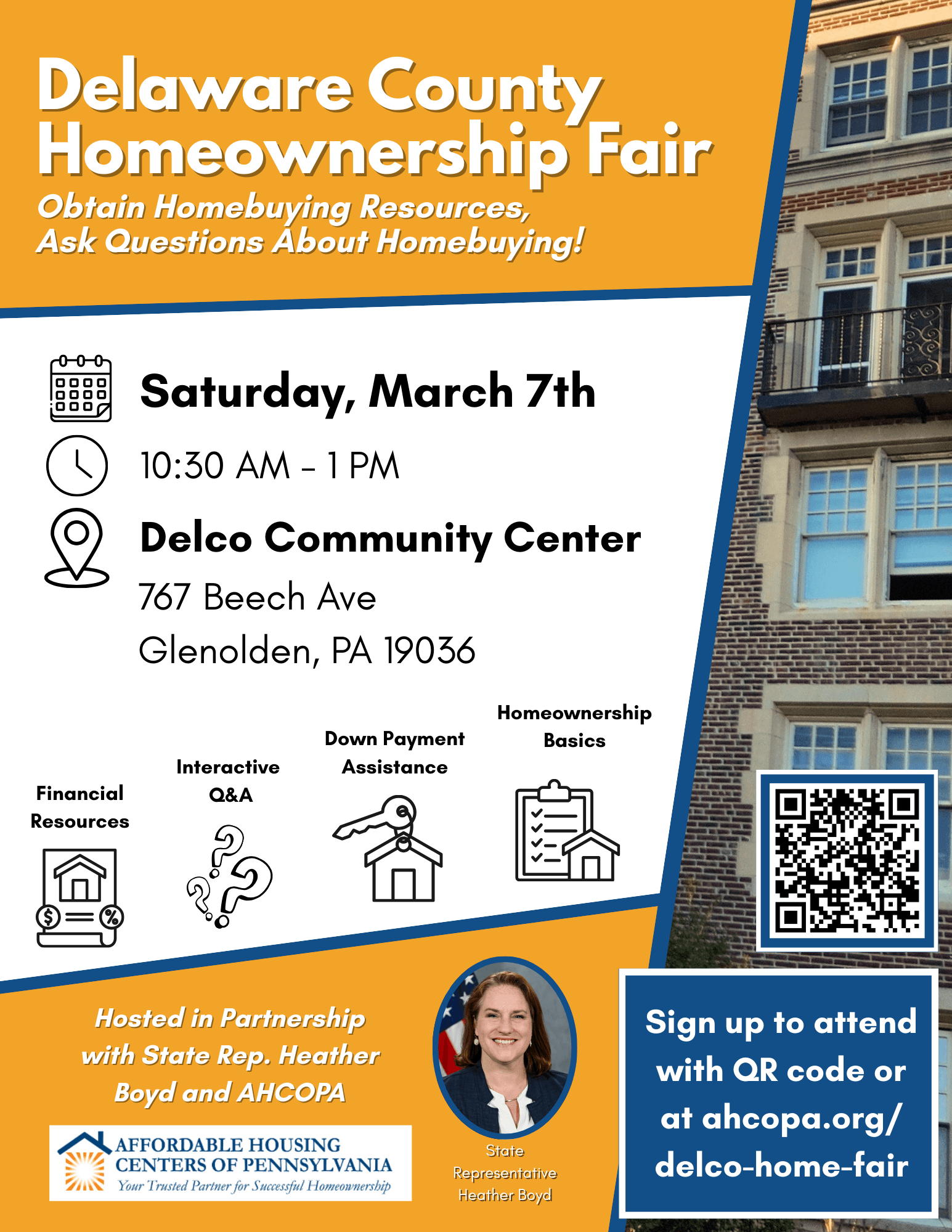 My office is partnering with the Affordable Housing Centers of Pennsylvania for our Delaware County Homeownership Fair! Scan the QR above or click here to sign up.