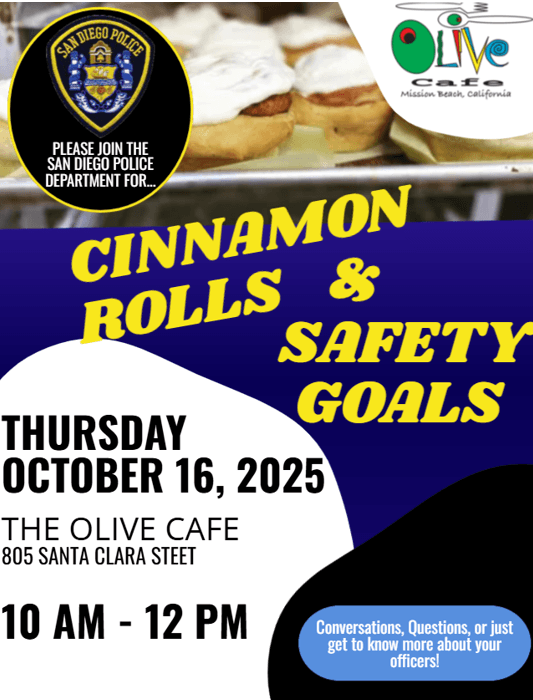 Join San Diego Police Department's Northern Division on October 16 from 10am to 12pm to get to know the officers serving your community over some fresh cinnamon rolls at The Olive Cafe in Mission Beach!