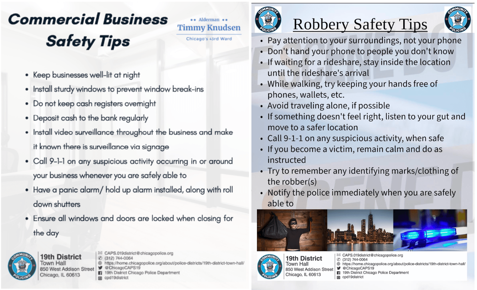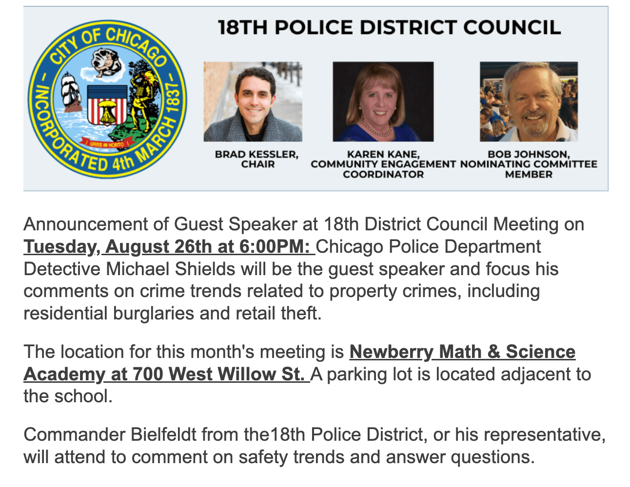We work closely with the 43rd Ward’s local CAPS districts, which include the 18th (Near North) and 19th (Town Hall) Police Districts. Our office is in frequent contact with officers from both of these districts and their local CAPS officers, who host a variety of community forums and events including beat meetings, informational settings, and expert panel discussions, as well as sending out community alerts when a pattern of crime is detected.