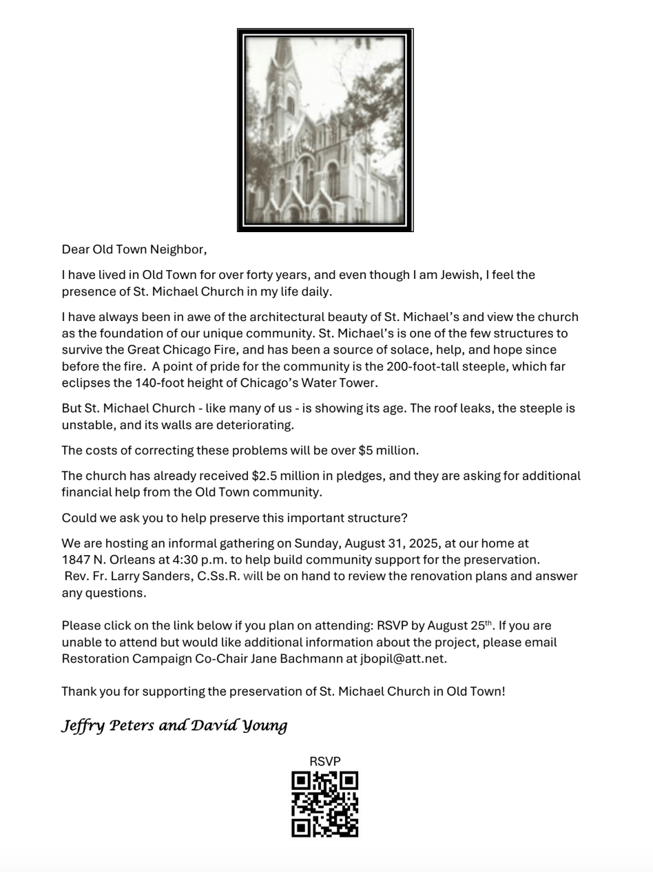 We are hosting an informal gathering on Sunday, August 31, 2025, at our home at 1847 N. Orleans at 4:30 p.m. to help build community support for the preservation. Rev. Fr. Larry Sanders, C.Ss.R. will be on hand to review the renovation plans and answer any questions. Please click here if you plan on attending: RSVP by August 25 If you are unable to attend but would like additional information about the project, please email Restoration Campaign Co-Chair Jane Bachmann at jbopil@att.net. Thank you for supporting the preservation of St. Michael Church in Old Town!