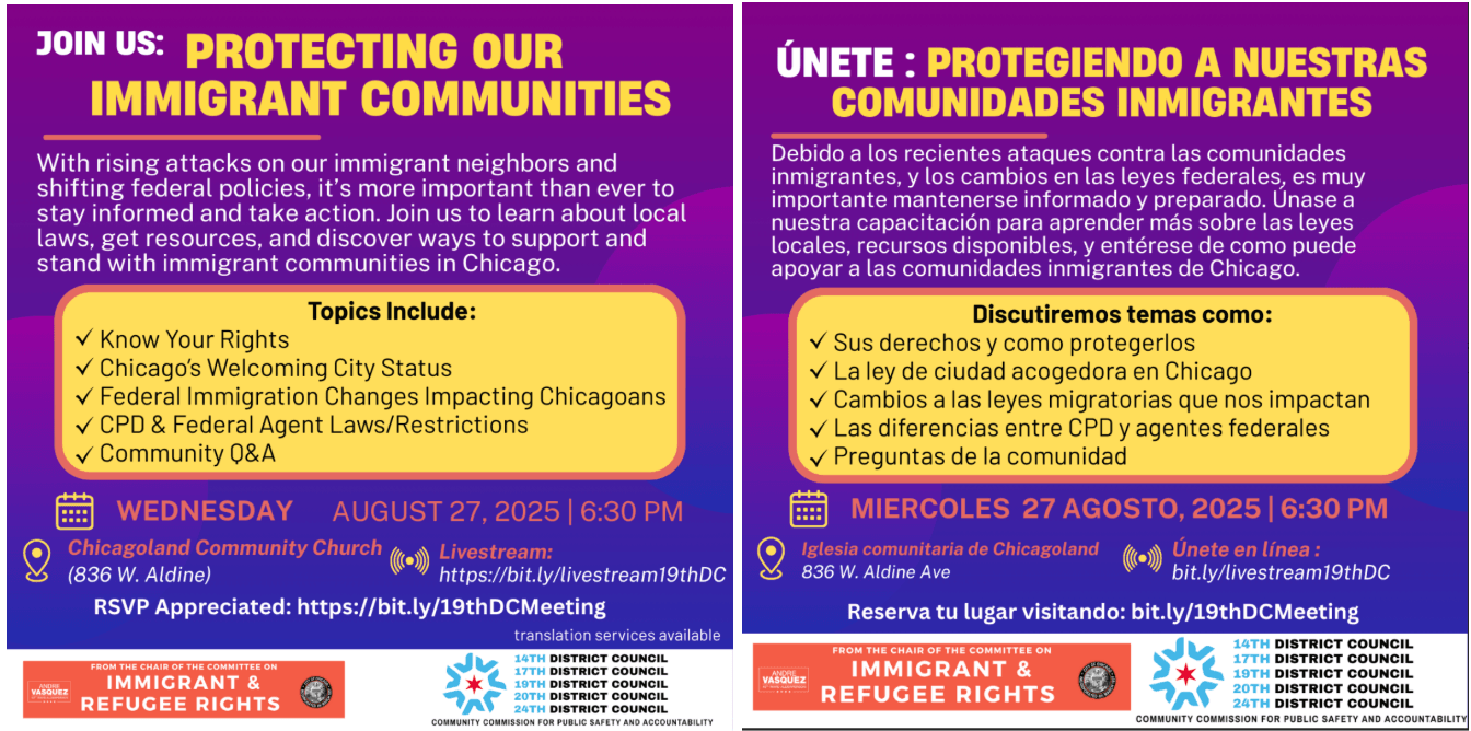 The upcoming 19th District Council meeting on Wednesday Aug. 27th at 6:30 at Chicagoland Community Church, will focus on an issue we have heard a lot about from neighbors — how we can protect immigrant communities in the face of escalating federal enforcement. We will be hosting representatives from the City Council Committee on Immigrant and Refugee Rights, along with our fellow Councilors from the 14th, 17th, 20th, and 24th Police Districts.