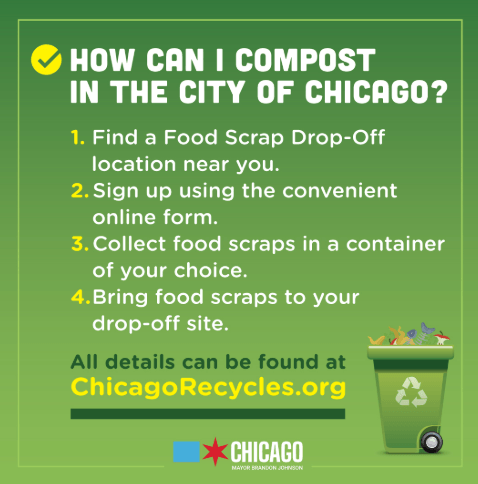 The City of Chicago offers a citywide Food Scrap Drop-Off Program, and all Chicago residents are welcome to drop off their household food scraps for composting at one of 20 locations across the city– for FREE! Composting keeps food scraps out of landfills, reduces harmful greenhouse gas emissions, and recycles nutrients that enrich soil. Thank you for helping to meet Chicago’s climate action goals and building healthy soil!