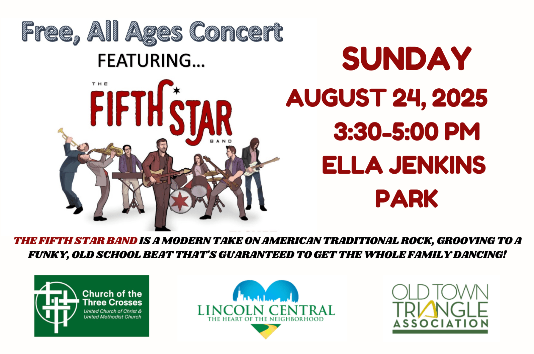 Ella Jenkins Park - Sunday, August 24th from 3:30 PM – 5:00 PM. Join the Lincoln Central Neighborhood Association, the Old Town Triangle Association and the Church of the Three Crosses for an afternoon of live music, local flavor, and community fun! Recently featured at the Old Town Art Fair, the Fifth Star Band brings a fresh twist to American traditional rock—mixing funky grooves with old-school energy that’ll have the whole family dancing! Neighborhood roots, Great vibes, and Free & family-friendly