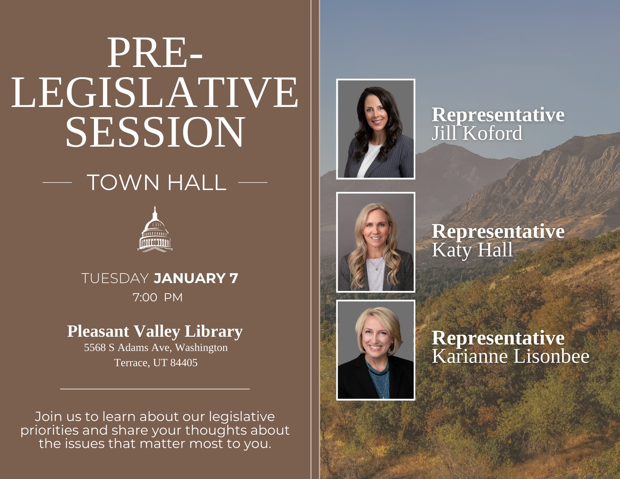 On Tuesday, January 7th, I will be co-hosting a pre-session townhall at the Pleasant Valley Library Black Box Theatre at 7pm, with House Majority Whip Karianne Lisonbee, and House District 11 Representative Katy Hall. We look forward to hearing from constituents, discussing the issues, and highlighting some of the legislative priorities for this session.