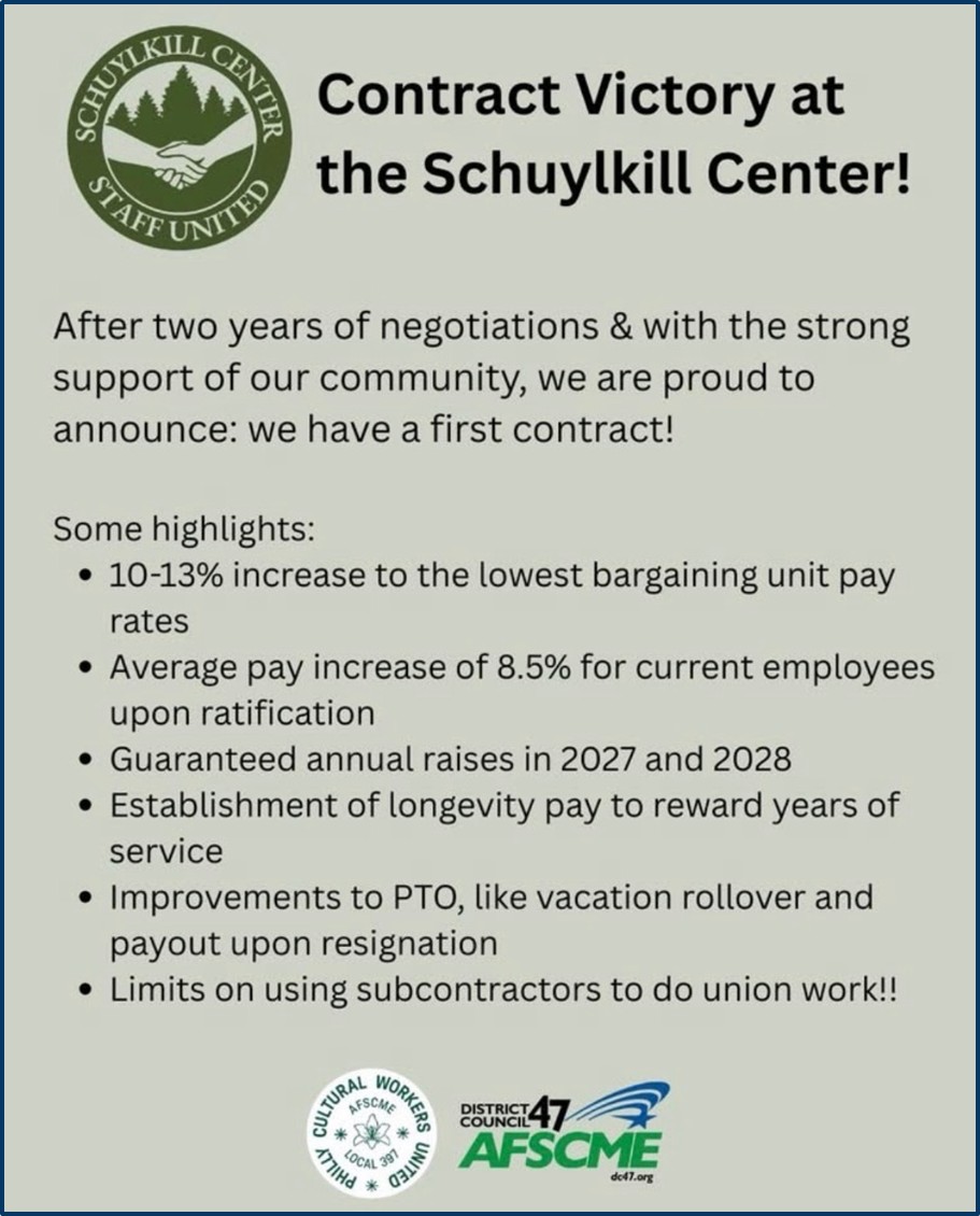 After two years of organizing, Philly Cultural Workers United secured their first contract at the Schuylkill Center! This is dignity, fairness, and real gains for workers!