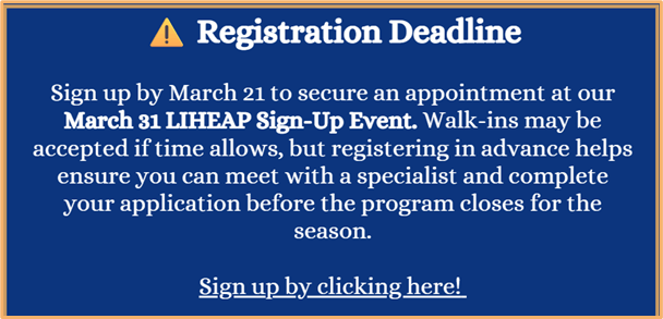 Also, sign up by March 21 to secure an appointment at our March 31 LIHEAP Sign-Up Event. Walk-ins may be accepted if time allows, but registering in advance helps ensure you can meet with a specialist and complete your application before the program closes for the season.