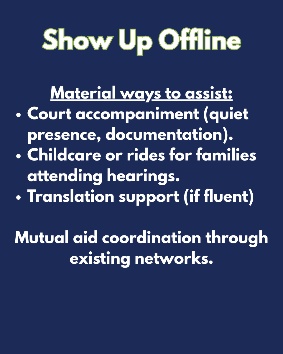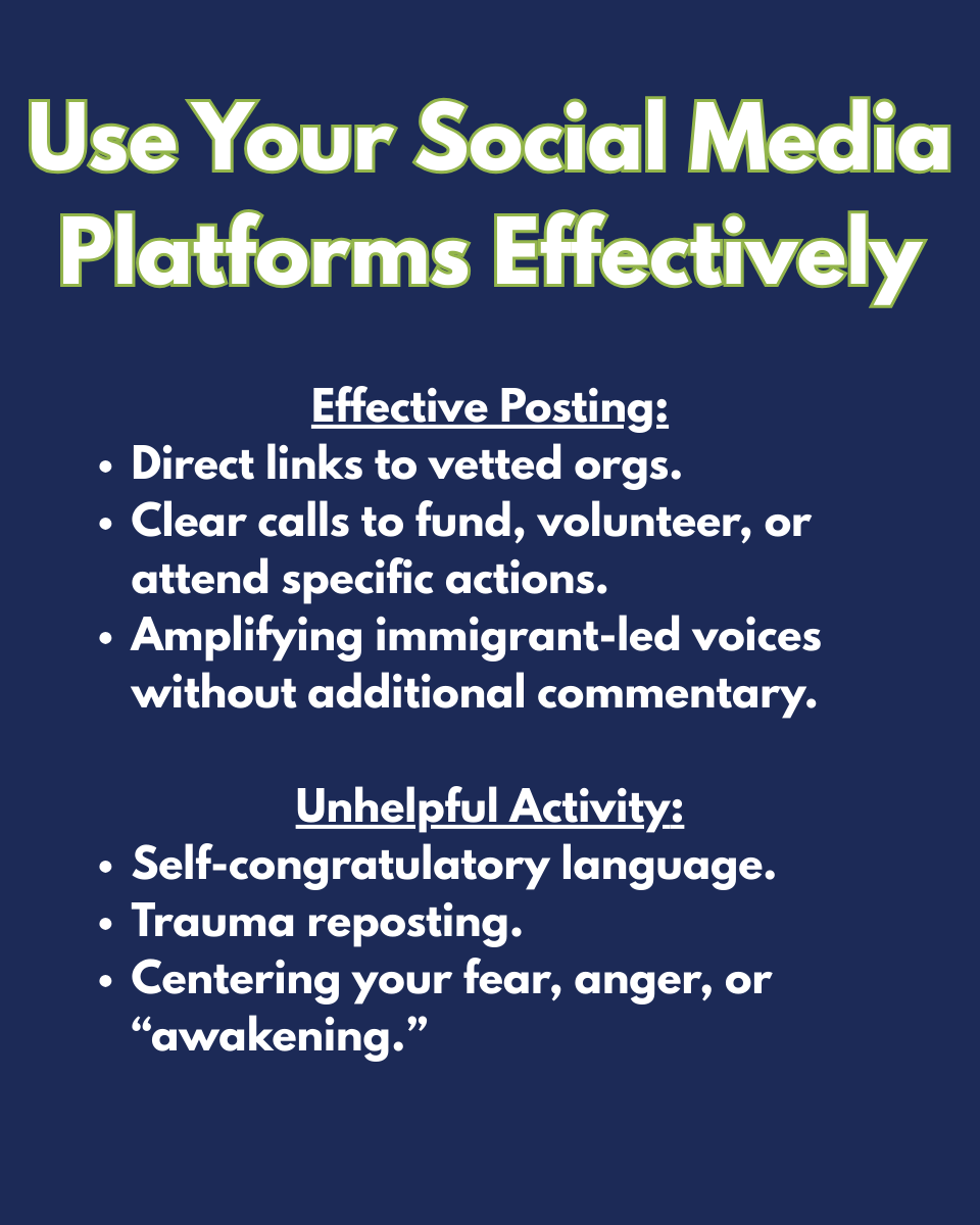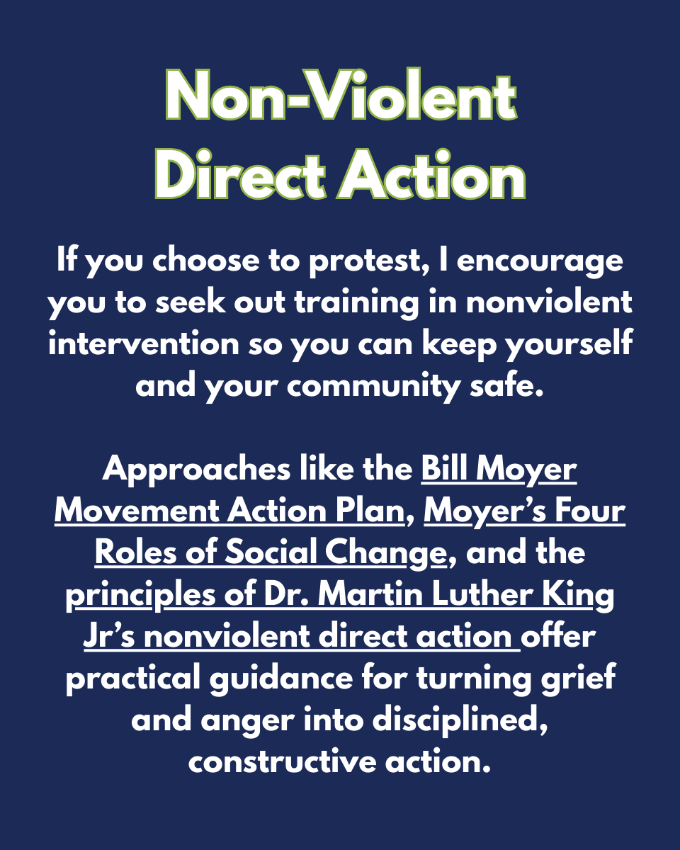 The graphics below show suggestions for concrete action all of us can take right now, without waiting for legislative action at the federal or state level. Please prioritize safety, both your own and the vulnerable communities we need to protect. Well-meaning people can cause unintentional harm.