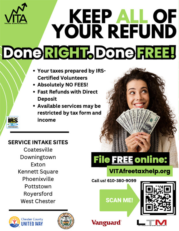 VITA sites across Chester County are now open for the season, with locations in Coatesville, Downingtown, Exton, Kennett Square, Phoenixville, Pottstown, Royersford, and West Chester.