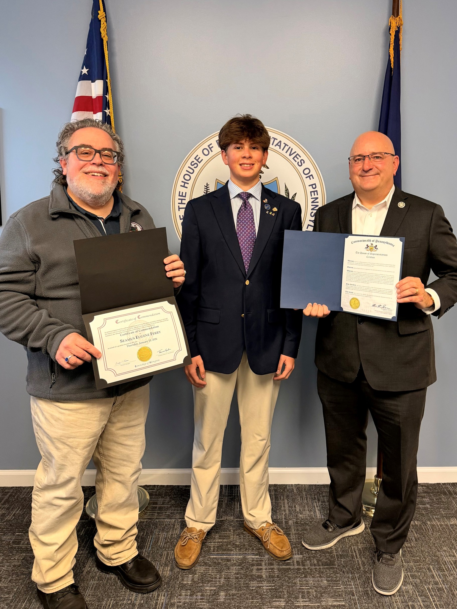 I was proud to welcome Seamus Ferry, a LaSalle College High School Senior and Abington resident, along with his parents Dan and Megan Ferry, to my office to present him with a Legislative Recognition to acknowledge his hard work and dedication to helping the homeless population in Philadelphia. Commissioner John Spiegelman from Abington Township Board of Commissioners joined us to present an Abington Commendation to him as well.