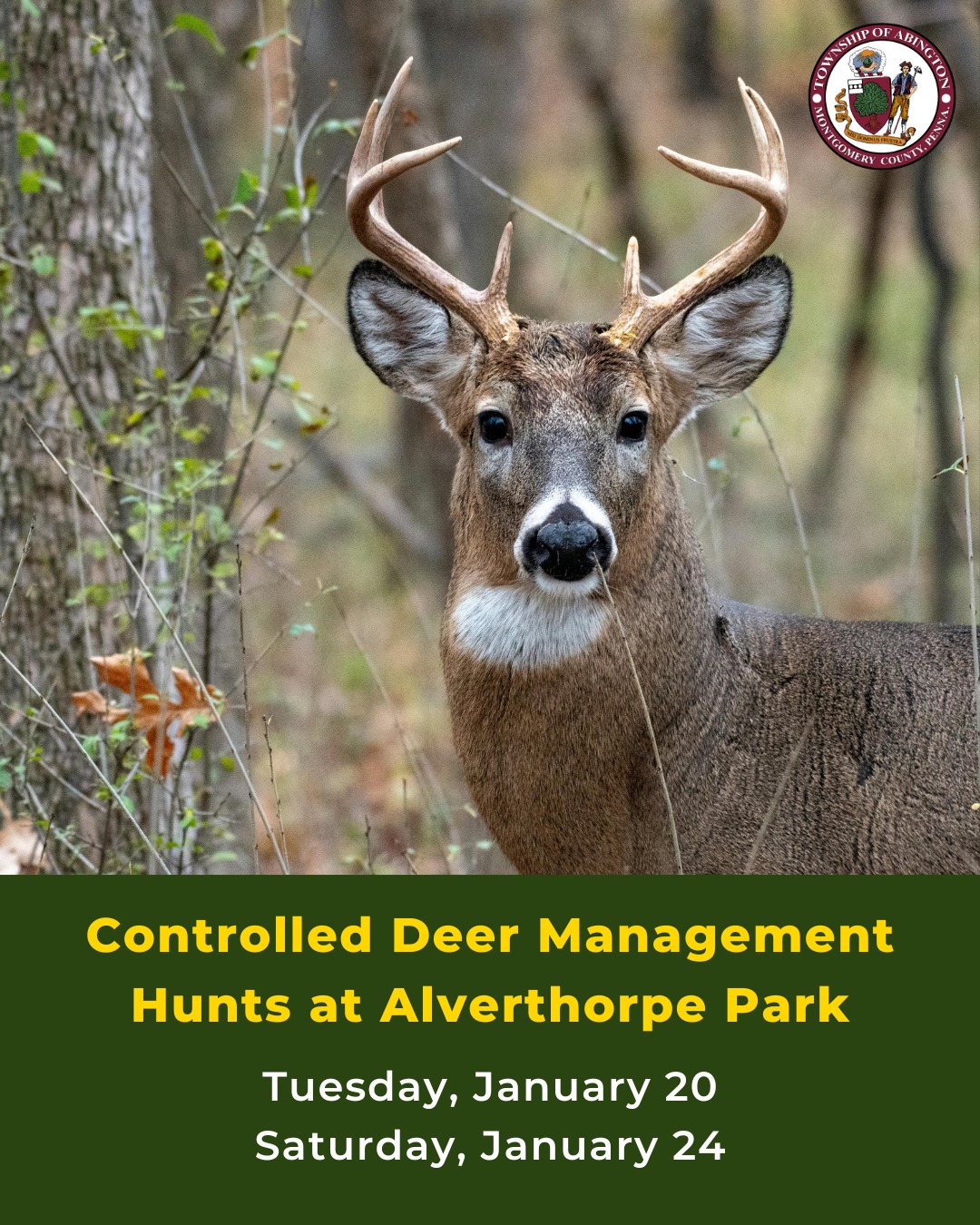 The Township has approved two (2) controlled archery hunts in Alverthorpe Park on Tuesday, January 20 and Saturday, January 24. During the times listed below, the Park will be closed to the public. Closure signage will be posted at all park entrances in advance. The Abington Township Police Department will be on site before, during, and after each hunt to ensure public safety, and all wooded areas will be secured and inspected prior to reopening the park.